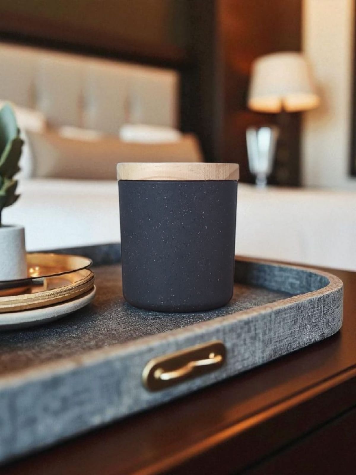 Vela aromática em pote de vidro reutilizável, Base Cinza Slate com Pigmentos Coloridos e tampa em madeira pinus.